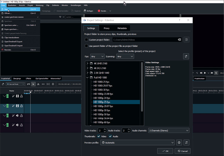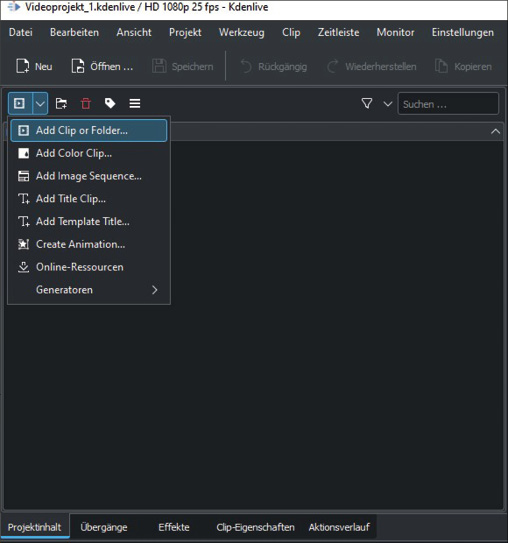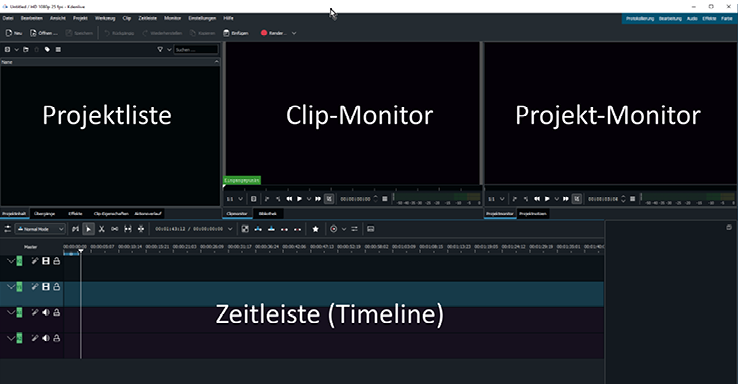Startest du ein neues Projekt, wird eine Projektdatei angelegt und mit einem Namen versehen. Sämtliche Spuren sind zu Beginn des Videoschnitts leer.