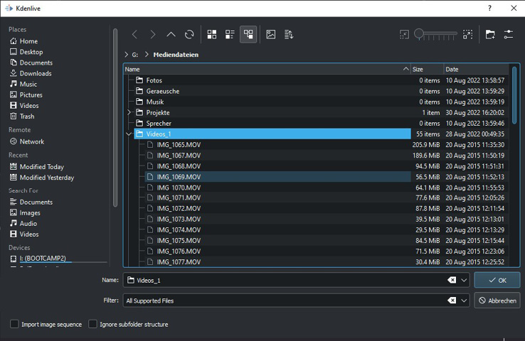 Wählst du entsprechend Abb. 6.14 den Ordner Medien­dateien, wird Kdenlive sämtliche Verzeichnisse und Unterverzeichnisse durchmustern und dieses Ergebnis liefern.