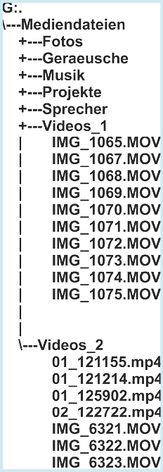 • Auf der Festplatte im Computer wird der Speicherplatz knapp. Eine neue Festplatte wird angeschlossen. Dabei wird gleich für »Ordnung« gesorgt. Die Medien­dateien werden gegliedert und nach Inhalt sortiert in verschiedenen Ordnern abgelegt. Beim Neustart der Videosoftware erscheinen jede Menge Fehlermeldungen.