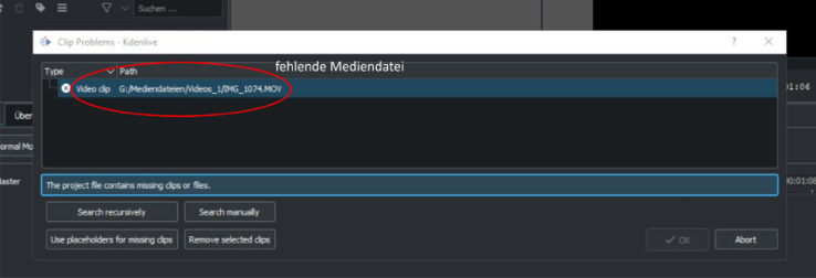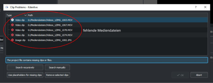 The project file contains missing clips or files (Die Projektdatei enthält fehlende Clips oder Dateien). Was ist passiert?