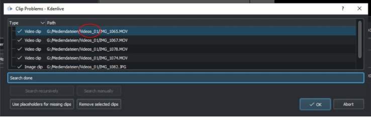 Kdenlive hat die verschwundenen Mediendateien nicht im ursprünglichen Ordner ... Video_1 gefunden, sondern in einem Ordner mit dem Namen ... Video_01. Bestätigst du das Suchergebnis mit OK, verwendet das Programm ab sofort diesen Ordner als Speicherplatz für die verloren gegangenen Mediendateien.