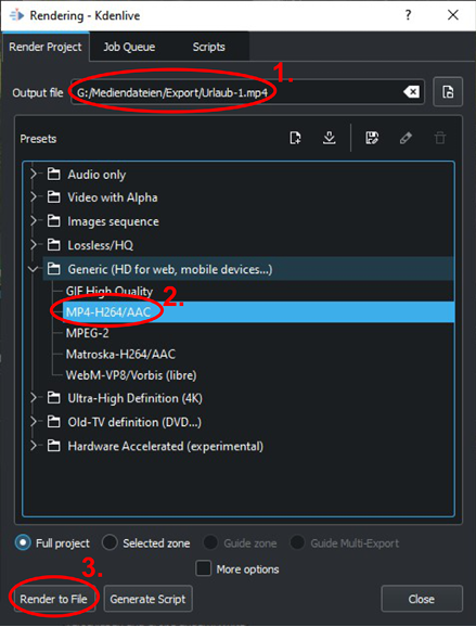 Läuft alles fehlerfrei, hat Kdenlive das gerenderte Video im Verzeichnis Output file abgelegt.